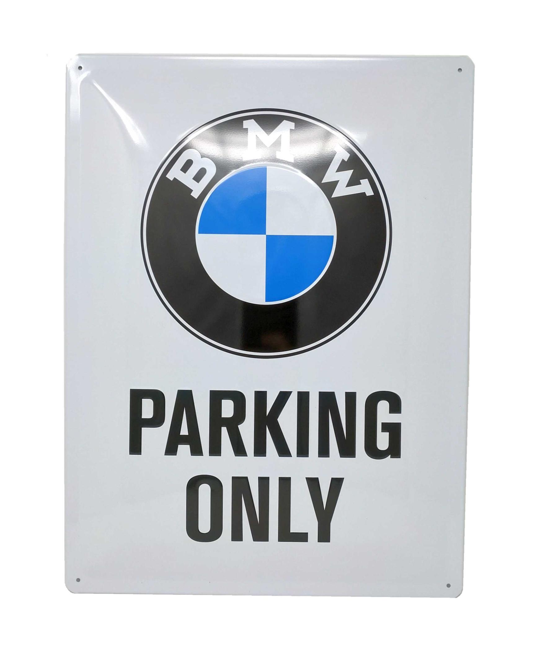 Das Schild zeigt das klassische BMW-Logo und trägt gut sichtbar die Aufschrift „PARKING ONLY“.